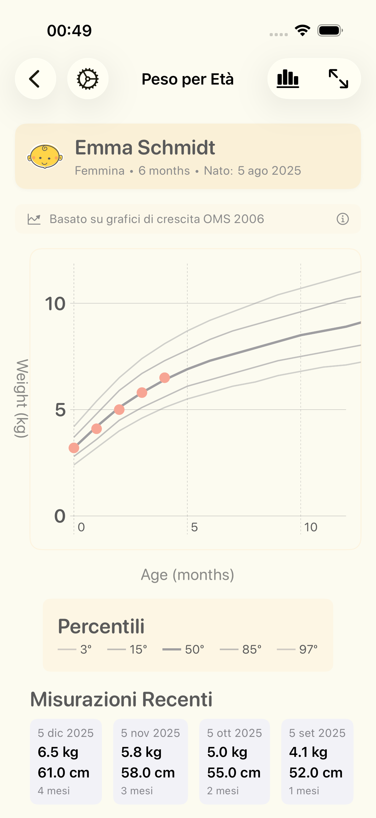 Scegli tra gli standard di crescita OMS 2006 e i grafici CDC 2000 in base alle raccomandazioni del tuo pediatra. Gli standard OMS sono ideali per i neonati allattati al seno, mentre i grafici CDC forniscono dati di riferimento della popolazione statunitense.